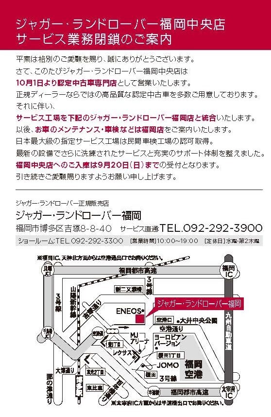 それにともない、サービス工場を下記、ジャガー・ランドローバー福岡店と統合いたします。