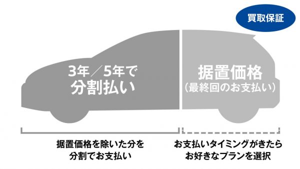 車両本体価格の一部を据え置き価格として設定し、残りを分割でお支払いいただくことで、月々のお支払いを大幅に軽減。
